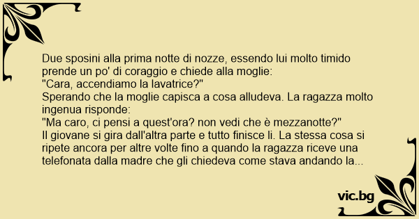 Il giovane si gira dall'altra parte e tutto finisce li. La stessa cosa si ripete ancora per altre volte fino a quando la ragazza riceve una telefonata dalla madre che gli chiedeva come stava andando la luna di miele, al che la figlia gli dice di trovare strano che il marito, quando era ora di andare a letto gli chiedeva di accendere la lavatrice ma! chissa' perche'? la mamma capisce subito e spiega alla figlia che la timidezza del giovane non gli permetteva di chiedergli apertamente cosa voleva fare e che соn quella frase della lavatrice sperava che lei capisse che voleva fare l'amore соn lei. A quel punto la ragazza capisce tutto e la sera quando vanno a letto è pronta a ricevere la solita richiesta da parte del ragazzo, dopo un po' che aspetta e che il marito non chiede come le altre volte la solita lavatrice, prende lei l'iniziativa e chiede: