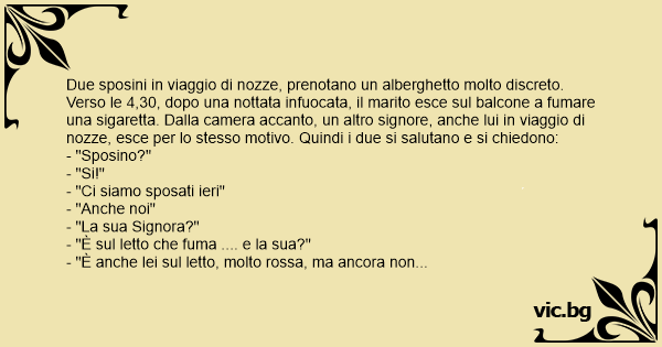 Due sposini in viaggio di nozze, prenotano un alberghetto molto discreto. Verso le 4,30, dopo una nottata infuocata, il marito esce sul balcone a fumare una sigaretta. Dalla camera accanto, un altro signore, anche lui in viaggio di nozze, esce per lo stesso motivo. Quindi i due si salutano e si chiedono: