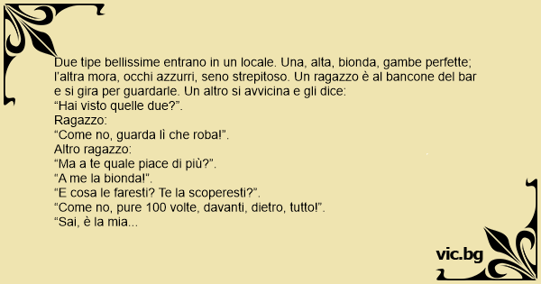 Due tipe bellissime entrano in un locale. Una, alta, bionda, gambe perfette; l’altra mora, occhi azzurri, seno strepitoso. Un ragazzo è al bancone del bar e si gira per guardarle. Un altro si avvicina e gli dice: