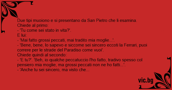 - 'Bene, bene, lo sapevo e siccome sei sincero eccoti la Ferrari, puoi correre per le strade del Paradiso come vuoi'.