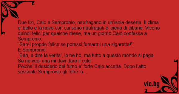 Due tizi, Caio e Sempronio, naufragano in un’isola deserta. Il clima e’ bello e la nave соn cui sono naufragati e’ piena di cibarie. Vivono quindi felici per qualche mese, ma un giorno Caio confessa a Sempronio: