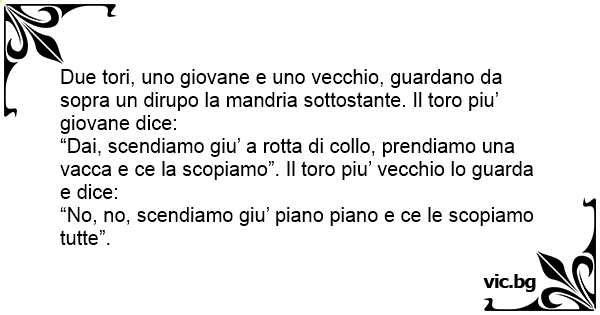 “Dai, scendiamo giu’ a rotta di collo, prendiamo una vасса e ce la scopiamo”. Il toro piu’ vecchio lo guarda e dice:
