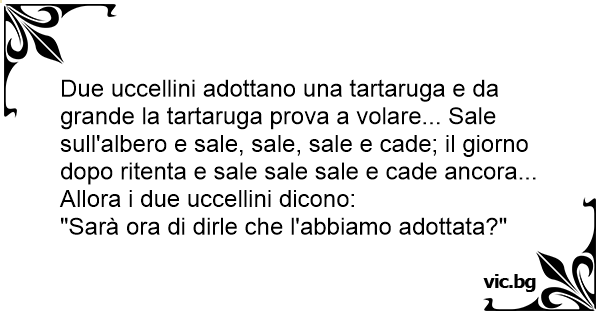 Er zitten twee vogels in een boom te kijken hoe een schildpad telkens weer uit een boom springt en dan met z'n poten gaat klapperen. Na een tijdje zegt de ene vogel tegen de ander: "Schat ik denk...