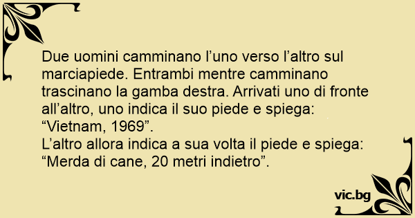 Due uomini camminano l’uno verso l’altro sul marciapiede. Entrambi mentre camminano trascinano la gamba destra. Arrivati uno di fronte all’altro, uno indica il suo piede e spiega: