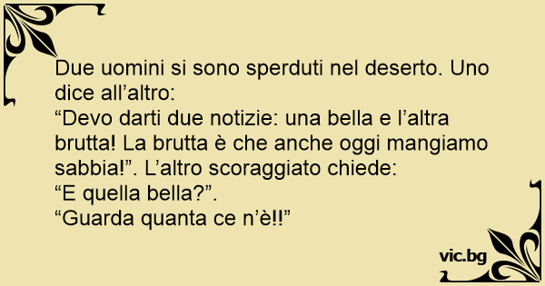 “Devo darti due notizie: una bella e l’altra brutta! La brutta è che anche oggi mangiamo sabbia!”. L’altro scoraggiato chiede:
