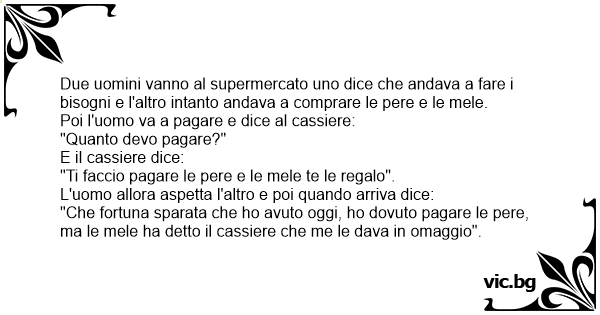 Due uomini vanno al supermercato uno dice che andava a fare i bisogni e l'altro intanto andava a comprare le pere e le mele.