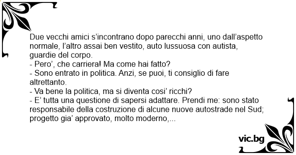 - Но seguito il tuo consiglio: sono entrato in politica anch’io. Facciamo un salto a casa mia, cosí ne parliamo meglio. Villa enorme, tennis, piscina, minigolf, ecc.