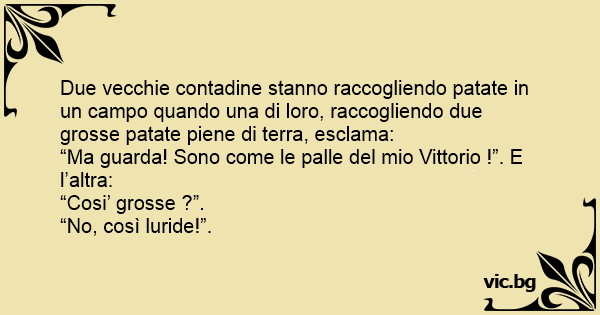 Due vecchie contadine stanno raccogliendo patate in un campo quando una di loro, raccogliendo due grosse patate piene di terra, esclama:
