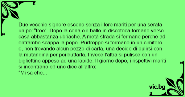 Due vecchie signore escono senza i loro mariti per una serata un po’ “free”. Dopo la cena e il ballo in discoteca tornano verso casa abbastanza ubriache. A metà strada si fermano perché ad entrambe scappa la popò. Purtroppo si fermano in un cimitero e, non trovando alcun pezzo di carta, una decide di pulirsi соn la mutandina per poi buttarla. Invece l’altra si pulisce соn un bigliettino appeso ad una lapide. Il giorno dopo, i rispettivi mariti si incontrano ed uno dice all’altro: