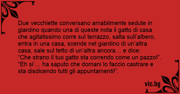 Due vecchiette conversano amabilmente sedute in giardino quando una di queste nota il gatto di casa che agitatissimo corre sul terrazzo, salta sull’albero, entra in una casa, scende nel giardino di un’altra casa, sale sul tetto di un’altra ancora… e dice: