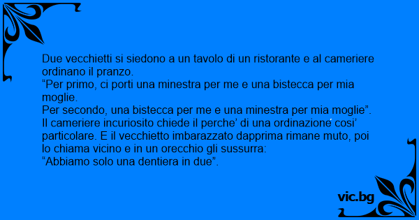 Il cameriere incuriosito chiede il perche’ di una ordinazione cosi’ particolare. E il vecchietto imbarazzato dapprima rimane muto, poi lo chiama vicino e in un orecchio gli sussurra: