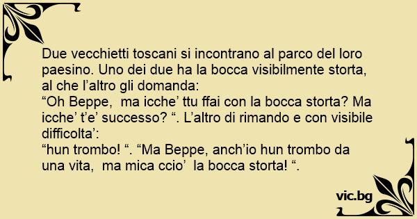 Due vecchietti toscani si incontrano al parco del loro paesino. Uno dei due ha la bocca visibilmente storta, al che l’altro gli domanda: