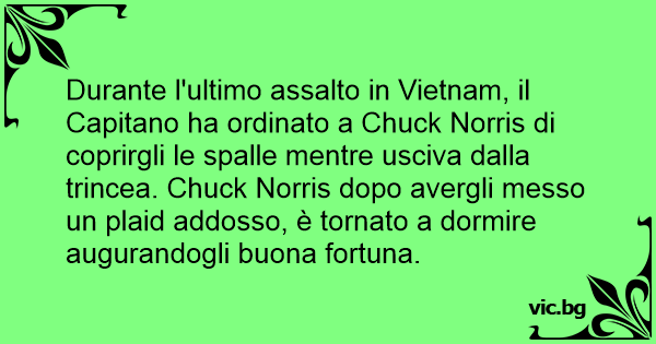 Durante l'ultimo assalto in Vietnam, il Capitano ha ordinato a Chuck Norris di coprirgli le spalle mentre usciva dalla trincea. Chuck Norris dopo avergli messo un plaid addosso, è tornato a dormire augurandogli buona fortuna.