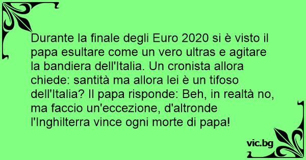 Durante la finale degli Euro 2020 si è visto il papa esultare come un vero ultras e agitare la bandiera dell'Italia. Un cronista allora chiede: santità ma allora lei è un tifoso dell'Italia? Il papa risponde: Beh, in realtà no, ma faccio un'eccezione, d'altronde l'Inghilterra vince ogni morte di papa!
