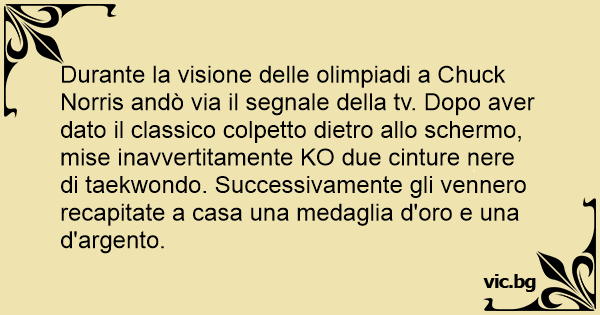 Durante la visione delle olimpiadi a Chuck Norris andò via il segnale della tv. Dopo aver dato il classico colpetto dietro allo schermo, mise inavvertitamente KO due cinture nere di taekwondo. Successivamente gli vennero recapitate a casa una medaglia d'oro e una d'argento.