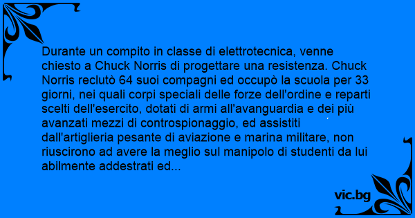 Durante un compito in classe di elettrotecnica, venne chiesto a Chuck Norris di progettare una resistenza. Chuck Norris reclutò 64 suoi compagni ed occupò la scuola per 33 giorni, nei quali corpi speciali delle forze dell'ordine e reparti scelti dell'esercito, dotati di armi all'avanguardia e dei più avanzati mezzi di controspionaggio, ed assistiti dall'artiglieria pesante di aviazione e marina militare, non riuscirono ad avere la meglio sul manipolo di studenti da lui abilmente addestrati ed incoraggiati. Prese 10 e lode.