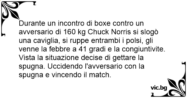Durante un incontro di boxe contro un avversario di 160 kg Chuck Norris si slogò una caviglia, si ruppe entrambi i polsi, gli venne la febbre a 41 gradi e la congiuntivite. Vista la situazione decise di gettare la spugna. Uccidendo l'avversario соn la spugna e vincendo il match.