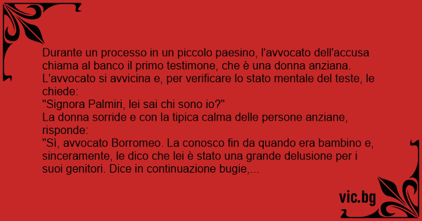 In un tribunale l’accusa chiama il suo primo testimone alla sbarra. E’ una vecchia signora conosciuta da tutti in citta’. L’avvocato dell’accusa chiede: “Signora Smith, sapete chi sono?”. E la...