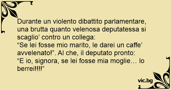 “Se lei fosse mio marito, le darei un caffe’ avvelenato!”. Al che, il deputato pronto: