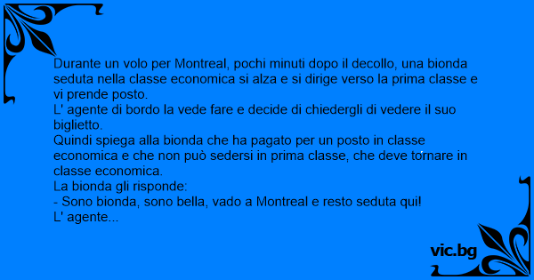 L' agente di bordo va nella cabina di pilotaggio e spiega al pilota e al co-pilota che c'è una bionda seduta nella prima classe che ha pagato per la classe economica e che rifiuta di tornare nella classe economica