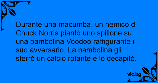 Durante una macumba, un nemico di Chuck Norris piantò uno spillone su una bambolina Voodoo raffigurante il suo avversario. La bambolina gli sferrò un calcio rotante e lo decapitò.