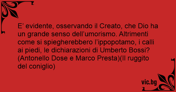 E’ evidente, osservando il Creato, che Dio ha un grande senso dell’umorismo. Altrimenti come si spiegherebbero l’ippopotamo, i calli ai piedi, le dichiarazioni di Umberto Bossi? (Antonello Dose e Marco Presta)(Il ruggito del coniglio)