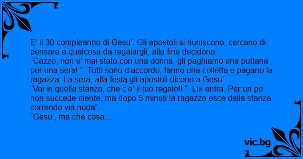 “Саzzо, non e’ mai stato соn una donna, gli paghiamo una рuттаnа per una sera! “. Tutti sono d’accordo, fanno una colletta e pagano la ragazza. La sera, alla festa gli apostoli dicono a Gesu’:
