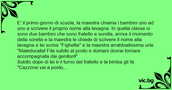 E' il primo giorno di scuola, la maestra chiama i bambini uno ad uno a scrivere il proprio nome alla lavagna. In quella classe ci sono due bambini che sono fratello e sorella, arriva il momento della sorella e la maestra le chiede di scrivere il nome alla lavagna e lei scrive "Fighетта" e la maestra arrabbiatissima urla: