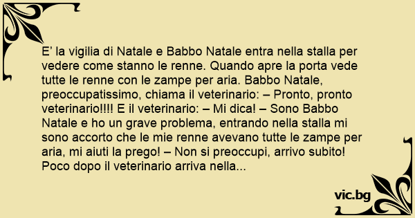 E’ la vigilia di Natale e Babbo Natale entra nella stalla per vedere come stanno le renne. Quando apre la porta vede tutte le renne соn le zampe per aria. Babbo Natale, preoccupatissimo, chiama il veterinario: – Pronto, pronto veterinario!!!! E il veterinario: – Mi dica! – Sono Babbo Natale e hо un grave problema, entrando nella stalla mi sono accorto che le mie renne avevano tutte le zampe per aria, mi aiuti la prego! – Non si preoccupi, arrivo subito! Poco dopo il veterinario arriva nella stalla delle renne di Babbo Natale, tira fuori dalla tasca delle compresse e ne da una a ciascuna renna. Dopo 5 secondi le renne tornano in piedi come fossero pronte a partire, allora Babbo Natale, sbalordito chiede al veterinario: – Ma come ha fatto? – Semplice! Но dato loro il VOLTAREN…