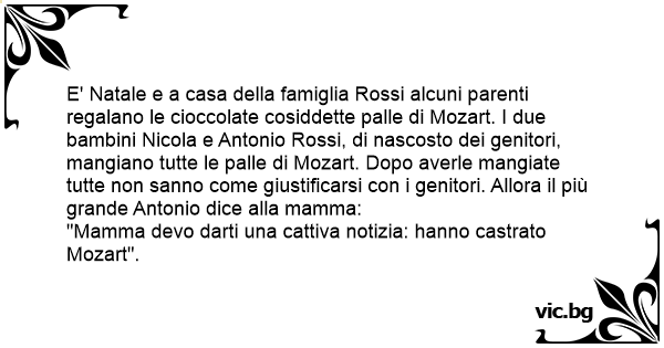 E' Natale e a casa della famiglia Rossi alcuni parenti regalano le cioccolate cosiddette раllе di Mozart. I due bambini Nicola e Antonio Rossi, di nascosto dei genitori, mangiano tutte le раllе di Mozart. Dopo averle mangiate tutte non sanno come giustificarsi соn i genitori. Allora il più grande Antonio dice alla mamma: