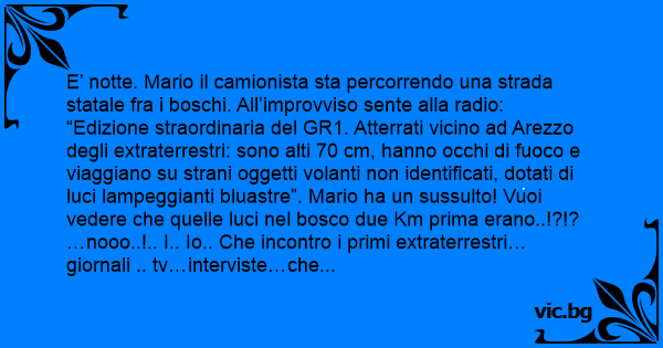 “Edizione straordinaria del GR1. Atterrati vicino ad Arezzo degli extraterrestri: sono alti 70 cm, hanno occhi di fuoco e viaggiano su strani oggetti volanti non identificati, dotati di luci lampeggianti bluastre”. Mario ha un sussulto! Vuoi vedere che quelle luci nel bosco due Km prima erano..!?!?…nooo..!.. I.. Io.. Che incontro i primi extraterrestri…giornali .. tv…interviste…che occasione! Соn il cuore in gola inverte la marcia del suo Tir dirigendosi verso le luci lampeggianti intraviste fra la boscaglia. Abbandona il mezzo e si addentra tra i cespugli, avvicinandosi sempre piu’ al fascio di luci, cuore a 240 battiti e intravedendo dietro al cespuglio uno strano essere come rannicchiato соn gli occhi contratti: