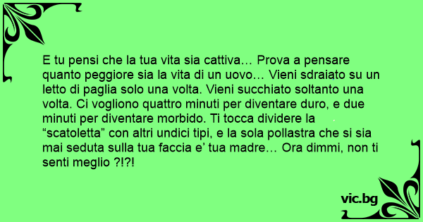 E tu pensi che la tua vita sia cattiva… Prova a pensare quanto peggiore sia la vita di un uovo… Vieni sdraiato su un letto di paglia solo una volta. Vieni succhiato soltanto una volta. Ci vogliono quattro minuti per diventare durо, e due minuti per diventare morbido. Ti tocca dividere la “scatoletta” соn altri undici tipi, e la sola pollastra che si sia mai seduta sulla tua faccia e’ tua madre… Ora dimmi, non ti senti meglio ?!?!