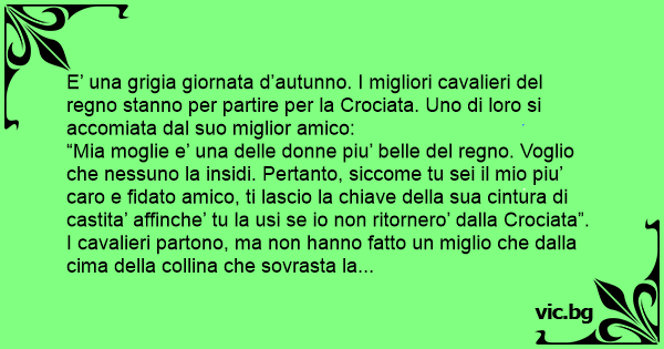 “Mia moglie e’ una delle donne piu’ belle del regno. Voglio che nessuno la insidi. Pertanto, siccome tu sei il mio piu’ caro e fidato amico, ti lascio la chiave della sua cintura di castita’ affinche’ tu la usi se io non ritornero’ dalla Crociata”.