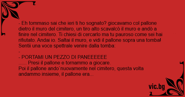 - Eh tommaso sai che ieri ti hо sognato? giocavamo col pallone dietro il muro del cimitero, un tiro alto scavalcò il muro e andò a finire nel cimitero. Ti chiesi di cercarlo ma tu pauroso come sei hai rifiutato. Andai io. Saltai il muro, e vidi il pallone sopra una tomba!