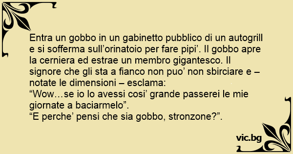Entra un gobbo in un gabinetto pubblico di un autogrill e si sofferma sull’orinatoio per fare pipi’. Il gobbo apre la cerniera ed estrae un membro gigantesco. Il signore che gli sta a fianco non puo’ non sbirciare e – notate le dimensioni – esclama: