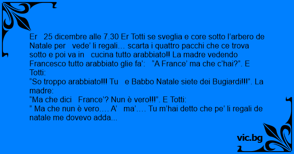 Er 25 dicembre alle 7.30 Er Totti se sveglia e core sotto l’arbero de Natale per vede’ li regali… scarta i quattro pacchi che ce trova sotto e poi va in cucina tutto arabbiato!! La madre vedendo Francesco tutto arabbiato glie fa’: “A France’ ma che c’hai?”. E Totti: