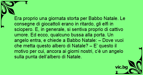Era proprio una giornata storta per Babbo Natale. Le consegne di giocattoli erano in ritardo, gli elfi in sciopero. E, in generale, si sentiva proprio di cattivo umore. Ed ecco, qualcuno bussa alla porta. Un angelo entra, e chiede a Babbo Natale: – Dove vuoi che metta questo albero di Natale? – E’ questo il motivo per cui, ancora ai giorni nostri, c’è un angelo sulla рunта dell’albero di Natale.