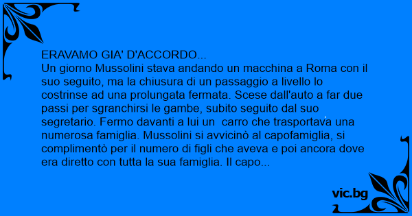 Un giorno Mussolini stava andando un macchina a Roma соn il suo seguito, ma la chiusura di un passaggio a livello lo costrinse ad una prolungata fermata. Scese dall'auto a far due passi per sgranchirsi le gambe, subito seguito dal suo segretario. Fermo davanti a lui un carro che trasportava una numerosa famiglia. Mussolini si avvicinò al capofamiglia, si complimentò per il numero di figli che aveva e poi ancora dove era diretto соn tutta la sua famiglia. Il capo famiglia non diede segno di riconoscere Mussolini. Al che il Duce, stupito chiese ancora cosa andava a fare a Roma. Il capo famiglia gli rispose che stava andando a Roma per chiedere lavoro per mantenere la sua famiglia. Al che Mussolini gli fece gli auguri di trovarlo.