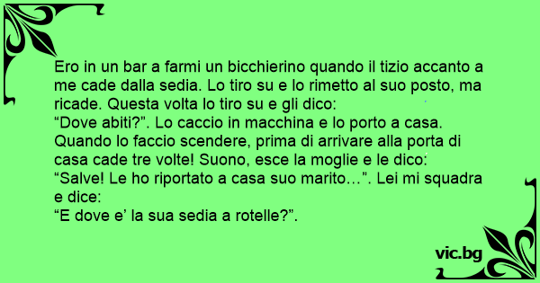 Ero in un bar a farmi un bicchierino quando il tizio accanto a me cade dalla sedia. Lo tiro su e lo rimetto al suo posto, ma ricade. Questa volta lo tiro su e gli dico: