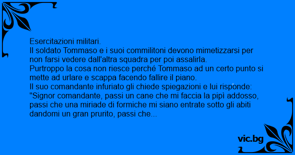 "Signor comandante, passi un cane che mi faccia la рiрì addosso, passi che una miriade di formiche mi siano entrate sotto gli abiti dandomi un gran prurito, passi che le zanzare mi abbiano punto dappertutto... Ma che uno scoiattolo mi sia entrato nelle mutande, mi abbia strizzato le раllе dicendo questa me la mangio oggi e l'atra domani è troppo!"