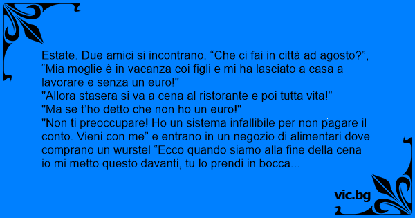 Estate. Due amici si incontrano. “Che ci fai in città ad agosto?”, “Mia moglie è in vacanza coi figli e mi ha lasciato a casa a lavorare e senza un euro!"