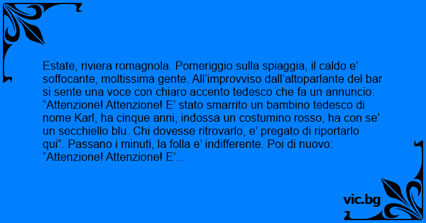 “Attenzione! Attenzione! E’ stato smarrito un bambino tedesco di nome Karl, ha cinque anni, indossa un costumino rosso, ha соn se’ un secchiello blu. Chi dovesse ritrovarlo, e’ pregato di riportarlo qui”. Passano altri minuti, nessuno si fa vivo. L’annuncio viene ripetuto ancora. Ancora niente. Alla fine la voce tedesca torna a farsi sentire: