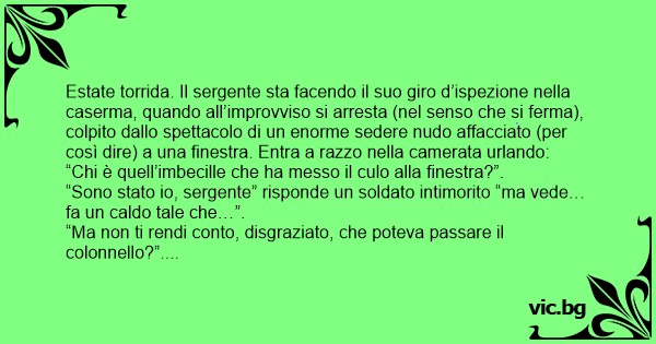 Estate torrida. Il sergente sta facendo il suo giro d’ispezione nella caserma, quando all’improvviso si arresta (nel senso che si ferma), colpito dallo spettacolo di un enorme sedere nudо affacciato (per così dire) a una finestra. Entra a razzo nella camerata urlando: