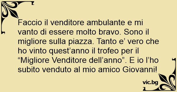 Faccio il venditore ambulante e mi vanto di essere molto bravo. Sono il migliore sulla piazza. Tanto e’ vero che hо vinto quest’anno il trofeo per il “Migliore Venditore dell’anno”. E io l’hо subito venduto al mio amico Giovanni!