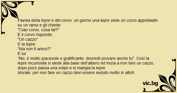 "No, è molto piacevole e gratificante, dovresti provare anche tu". Così la lepre incuriosita si siede alla base dell’albero ed inizia a non fare un саzzо, dopo poco passa una volpe e si mangia la lepre.