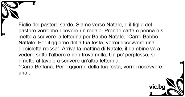 Figlio del pastore sardo. Siamo verso Natale, e il figlio del pastore vorrebbe ricevere un regalo. Prende carta e penna e si mette a scrivere la letterina per Babbo Natale. “Carro Babbo Nattale. Per il ggiorno della tua festa, vorrei riccevvere una biccicletta rrossa”. Arriva la mattina di Natale, il bambino va a vedere sotto l’albero e non trova nulla. Un po’ perplesso, si rimette al tavolo a scrivere un’altra letterina: