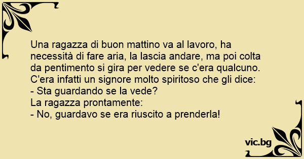 Una ragazza di buon mattino va al lavoro, ha necessità di fare aria, la lascia andare, ma poi colta da pentimento si gira per vedere se c'era qualcuno.