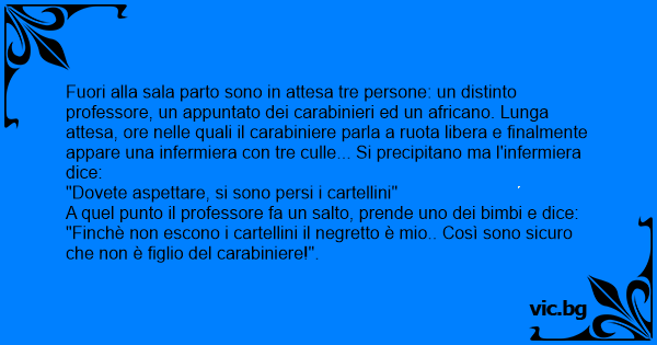 Fuori alla sala parto sono in attesa tre persone: un distinto professore, un appuntato dei carabinieri ed un africano. Lunga attesa, ore nelle quali il carabiniere parla a ruota libera e finalmente appare una infermiera соn tre culle... Si precipitano ma l'infermiera dice: