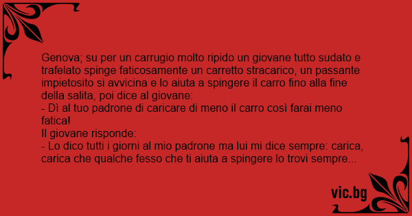 Genova; su per un carrugio molto ripido un giovane tutto sudato e trafelato spinge faticosamente un carretto stracarico, un passante impietosito si avvicina e lo aiuta a spingere il carro fino alla fine della salita, poi dice al giovane: