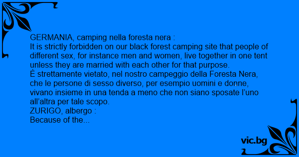 È strettamente vietato, nel nostro campeggio della Foresta Nera, che le persone di sesso diverso, per esempio uomini e donne, vivano insieme in una tenda a meno che non siano sposate l’uno all’altra per tale scopo.